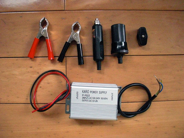 LED每顆是0.25W,0.25WX18顆=4.5W,4.5W/12V=0.375A也就是說一支燈條要用到0.4mA左右的電流,這次買四支需要用到1.6A的電源,所以買了一顆AC110V/DC12V2A的變壓器,有市電的地方就綽綽有餘,另外買了雪茄插頭及座以及30A電瓶用夾頭,如此不管露營場或是野營地就通通都能使用了。